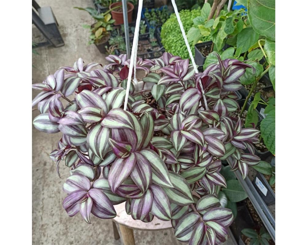 Цвет листа необычный, от темного зеленого с багровым оттенком до фиолетового, через пурпурный. Низ листа обязательно окрашен, зеленые оттенки появляются только на внешней стороне при недостатке освещения. Цветы «Зебрины» сиреневые или лиловые, мелкие, пазушные, но смотрятся очень мило. Стебли окрашенные, без опушения, до 80 сантиметров длиной, ниспадающие. В этом его прелесть. Среди ампельных растений равных «Зебрине» нет.
