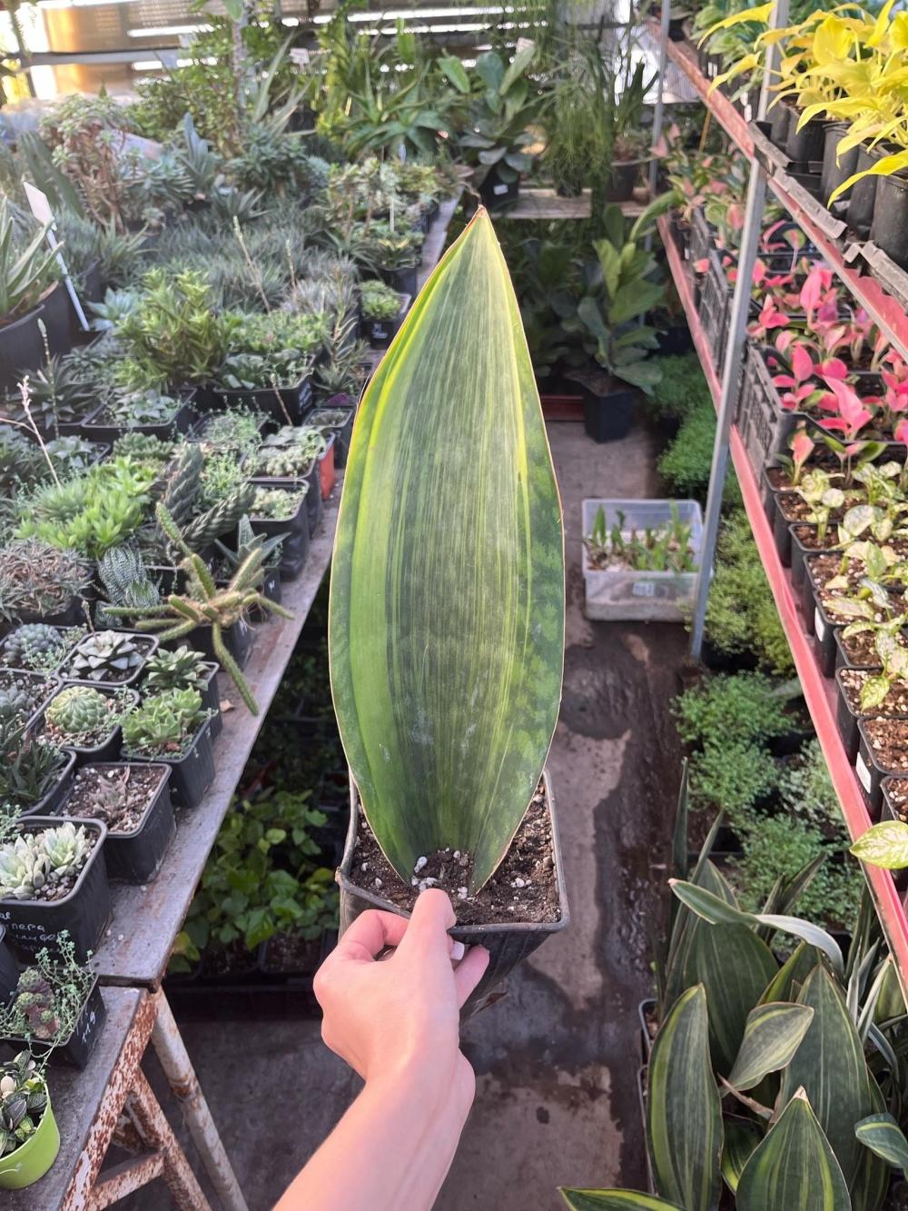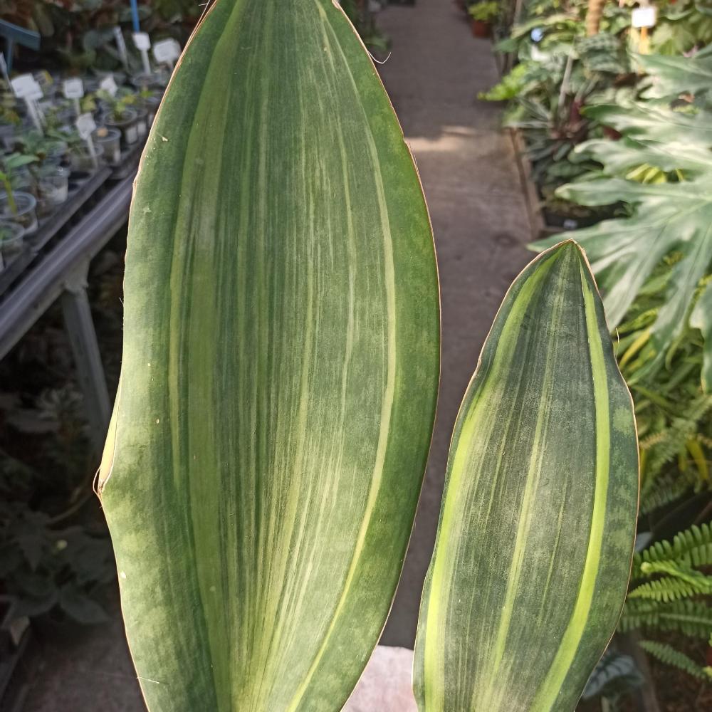 Сансевиерия Масониана вариегатная, также известная как 'Aurea' или «крыло акулы», — это редкий коллекционный сорт с крупными, мясистыми листьями овальной формы, украшенными яркими золотисто-зелёными вариегатными узорами. Листья имеют насыщенно-зеленые края и центральную полосу светлого, желто-золотого цвета. Сорт вынослив, неприхотлив и хорошо растет в полутени или при ярком рассеянном свете.