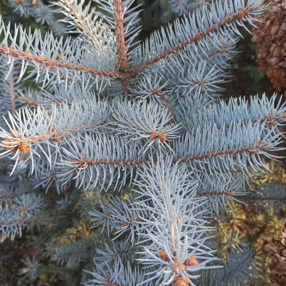 Хвоя: Серебристо-голубая, колючая, 2-3 см, радиально расположенная.