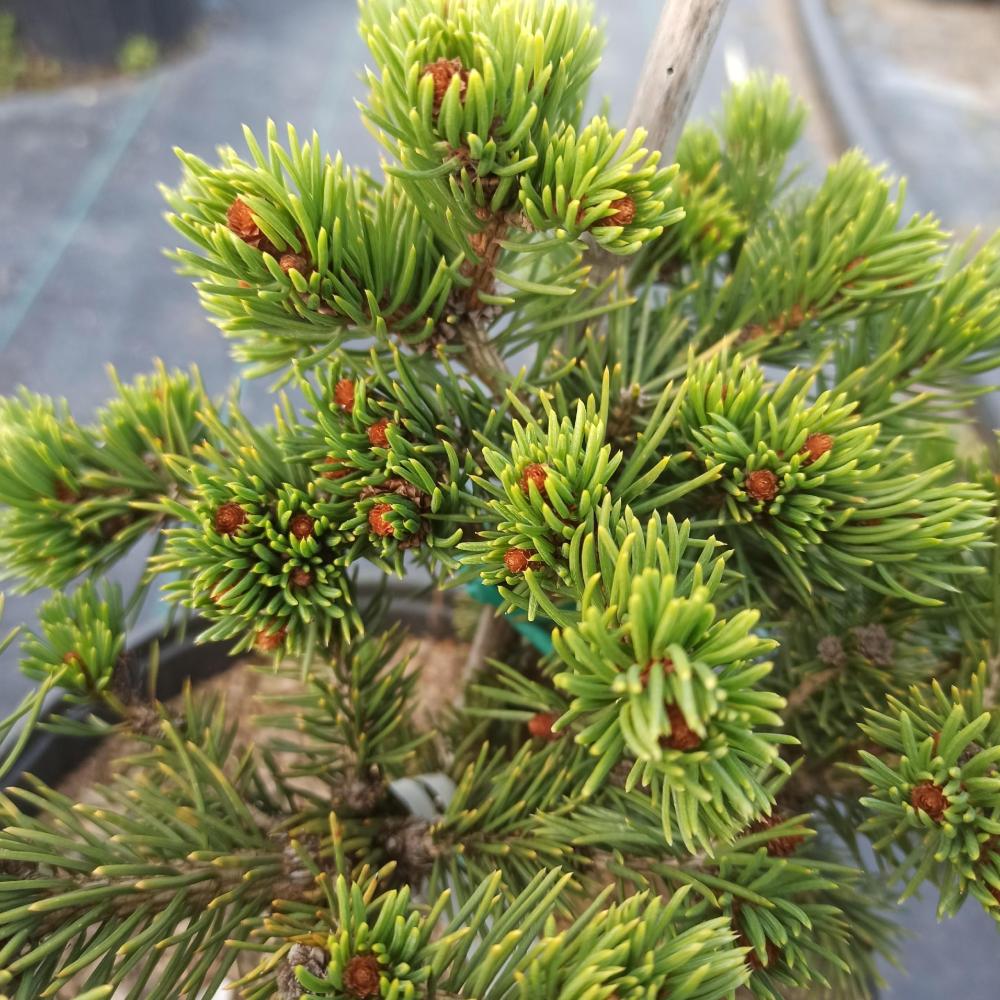 Декоративна вертикальной, неправильной формой кроны, зеленой хвоей, молодыми приростами салатового цвета, крупными лилово-красными шишками.