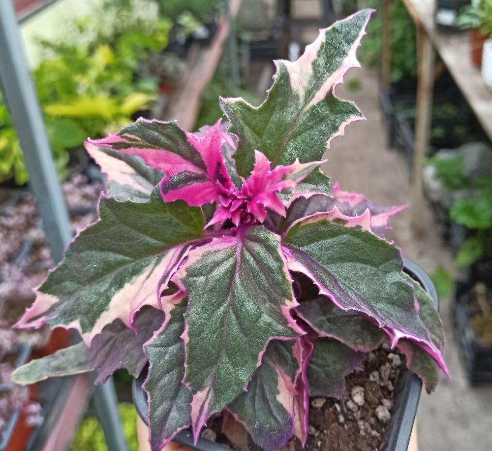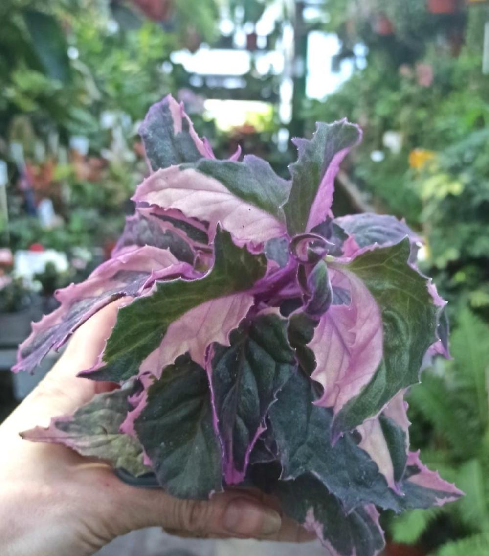 Листья: Необычной окраски — зеленые участки сочетаются с кремово-белыми или желтоватыми пятнами, создавая контраст. Поверхность покрыта мягкими фиолетовыми волосками, придающими бархатистость. Молодые листья могут иметь розоватый оттенок. Опушение: Фиолетовое, покрывает все части растения, добавляя текстуры. Форма роста: Ампельная, с поникающими побегами, формирует пышный куст. Идеальна для подвесных кашпо, но может нуждаться в опоре, если растет кустиком.