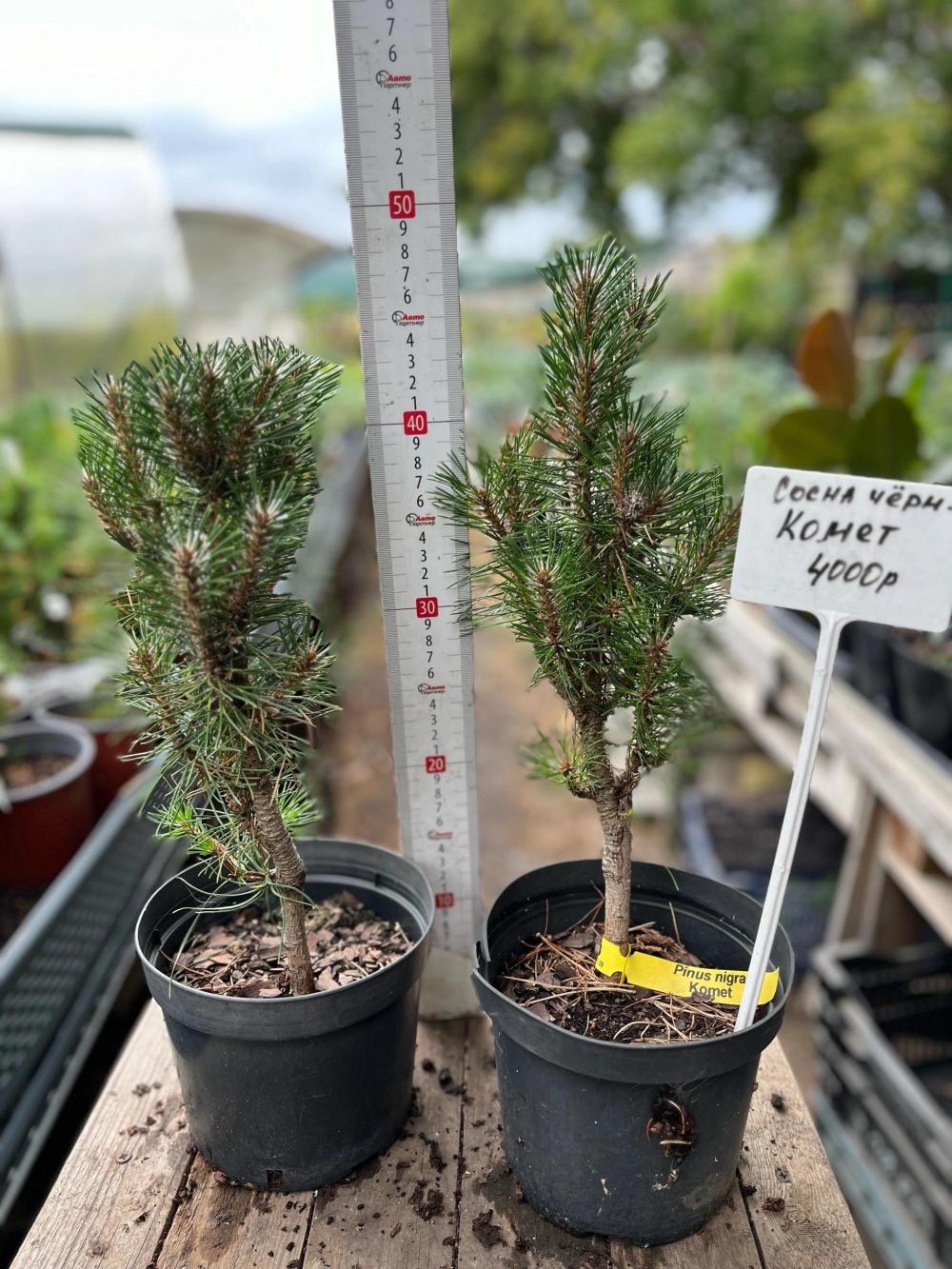 Сосна черная 'Komet' (Комет) — это вечнозеленое деревце с компактной, узкоконической или колоновидной кроной и короткими побегами, направленными строго вверх, что напоминает ракету. Имеет темно-зеленую, плотную, длинную хвою, собранную в пучки по две. Достигает 3-4 метров в высоту, светолюбива, не требовательна к почве, но не терпит застоя воды, морозостойка (до -35°C), но молодые растения нуждаются в укрытии в суровые зимы.