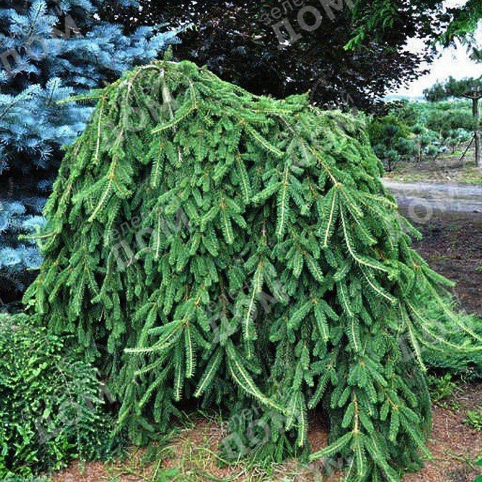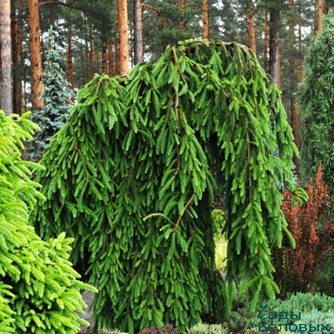 Крона: Узкопирамидальная, плакучая, с побегами, свисающими до земли. Ветви стелются по земле, создавая ковёр.