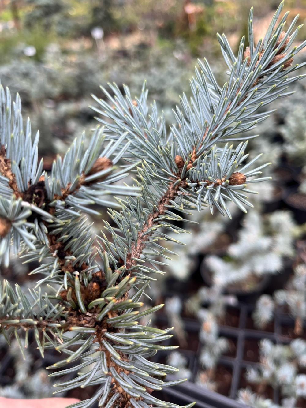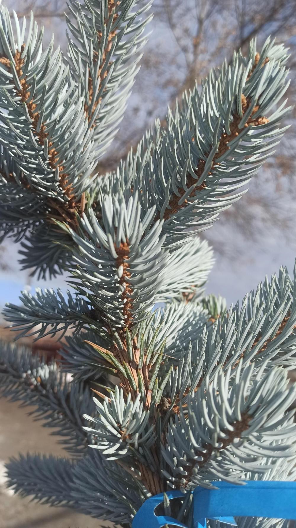 Хвоя: Жесткая, колючая, серебристо-голубая, очень яркая, молодые приросты особенно голубые, что создает красивый контраст.