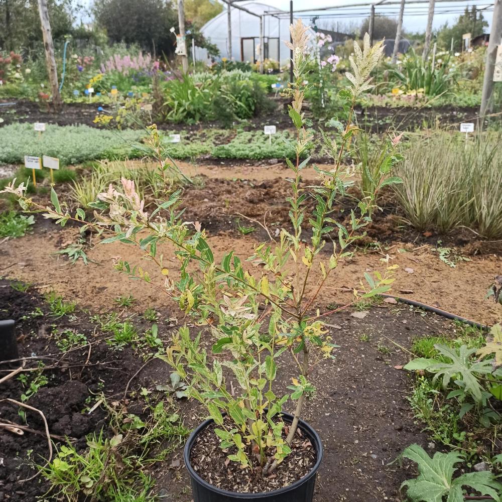Ива цельнолистная «Хакуро-Нишики» — декоративный кустарник или небольшое деревце (часто формируется на штамбе) с шаровидной кроной и уникальной окраской листвы: молодые листья розово-белые, к лету становятся бело-зелеными, а осенью желтеют, а побеги гибкие, красновато-коричневые, ранней весной появляются пурпурные сережки-цветы, сорт морозостойкий, светолюбивый, требует влажной почвы, хорошо переносит стрижку.