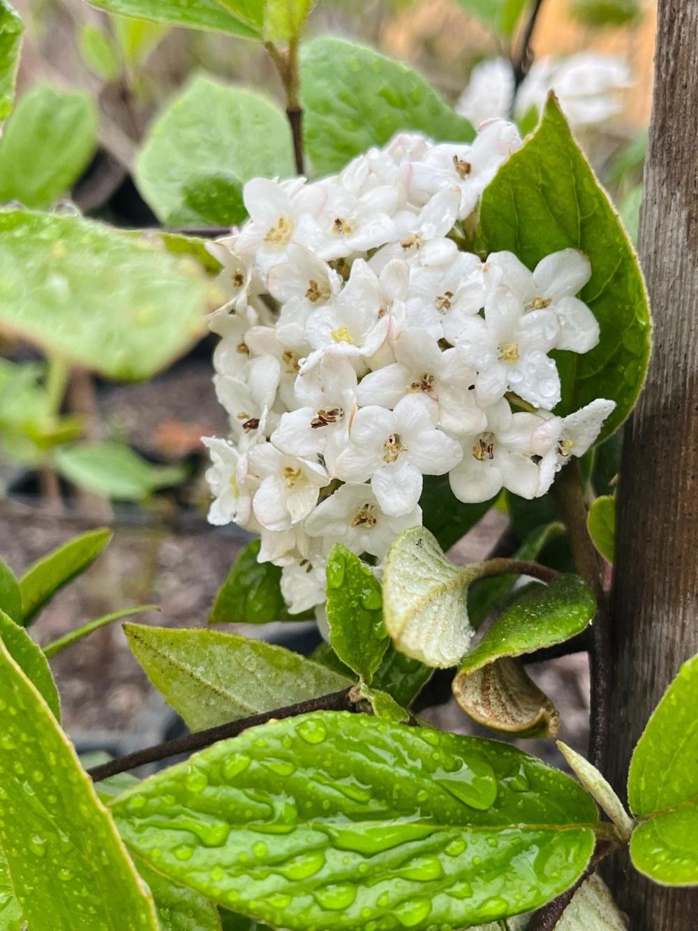 Цветы: Белые с розовыми пятнами, собраны в шаровидные соцветия (до 8 см), сильно душистые (сладкий аромат). Бутоны розовые.
