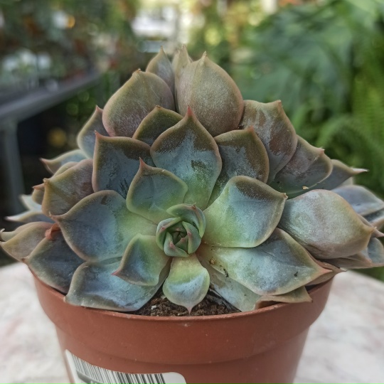 Эхеверия с широкими симметричными листьями серовато-пурпурного оттенка. В стрессовых условиях листья приобретает розовый оттенок.