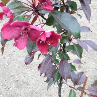 Яблоня декоративная 'Royalty' (Роялти) – популярный гибрид с пурпурно-красными листьями, крупными рубиново-красными цветами, похожими на сакуру, и мелкими, несъедобными тёмно-красными плодами. Это среднерослое дерево (до 4-6 м), устойчивое к морозам и городской среде, ценится в ландшафтном дизайне за декоративность весь сезон: от яркого цветения весной до багряных листьев осенью.