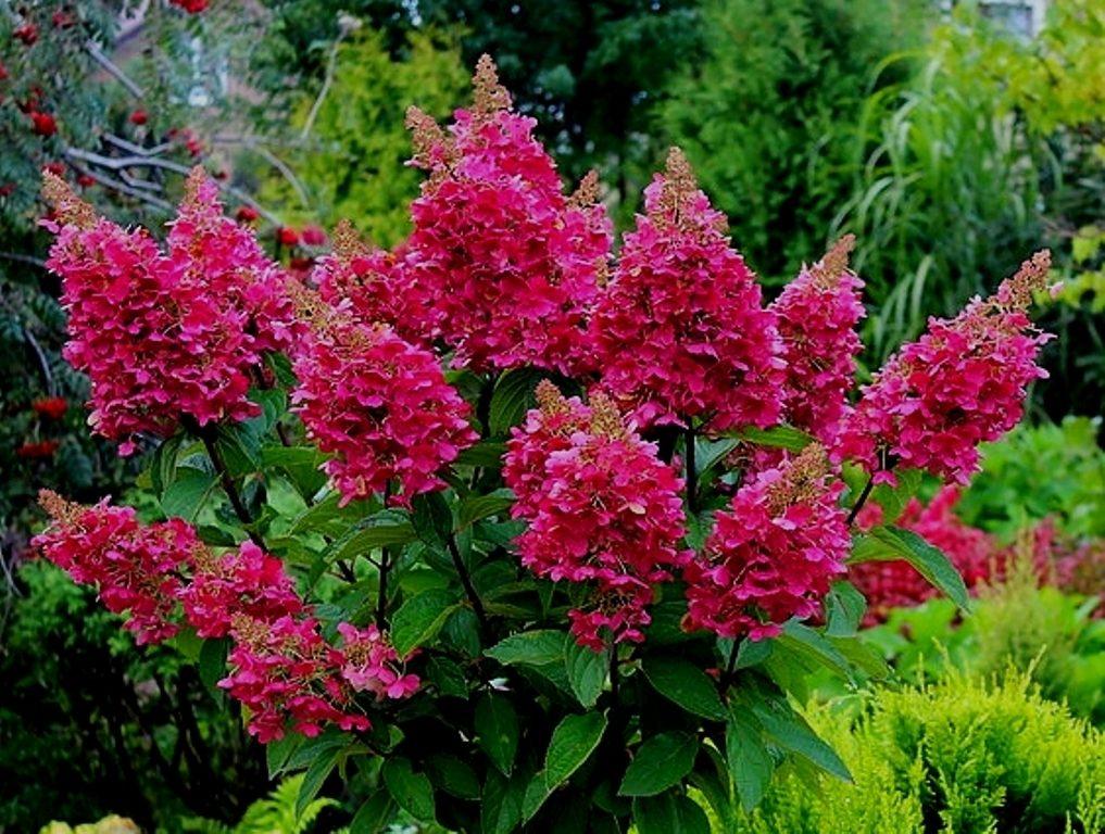 Гортензия метельчатая Вимс Ред – компактный кустарник (до 2 м) с прочными темно-красными побегами и крупными, пирамидальными соцветиями до 40 см, меняющими цвет от белого к розовому, а к осени – к насыщенно-винно-красному, с сильным медовым ароматом. Цветет с июня до октября, зимостойка (до -30°C), любит плодородные, умеренно влажные, слабокислые почвы и полутень.