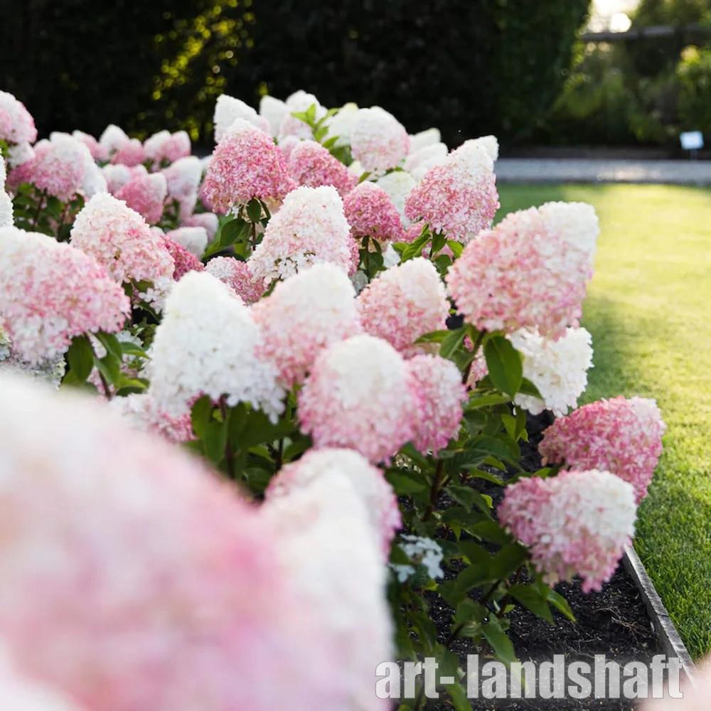 Гортензия метельчатая 'Pink & Rose' (Пинк энд Роуз) — это компактный кустарник (1-1.3 м высотой, до 1.2 м шириной) с сильными побегами, который не разваливается под тяжестью крупных, широкопирамидальных соцветий, меняющих цвет с белого на розовый, а затем на малиново-розовый с июля по сентябрь, напоминая «клубничное мороженое». Сорт отличается высокой зимостойкостью (до -29°C), неприхотливостью, хорош для живых изгородей, одиночных и групповых посадок.