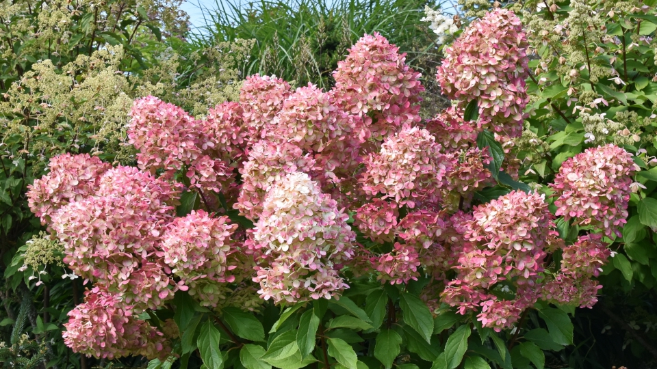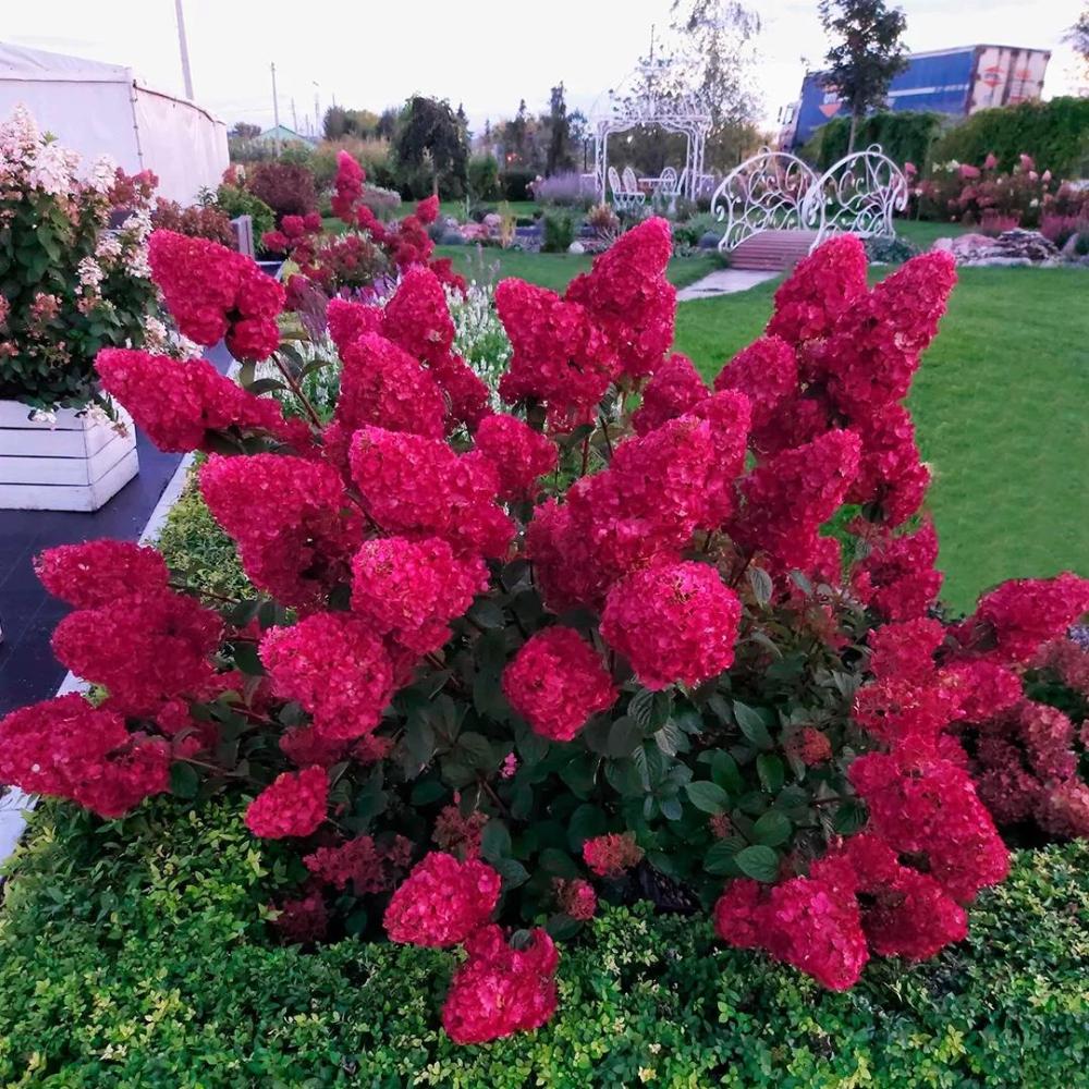 Гортензия метельчатая «Вимс Ред» (Wim's Red) — компактный кустарник (до 1.5-2 м) с темно-красными побегами и крупными, меняющими цвет соцветиями (белые -> розовые -> винно-красные к осени), цветет с лета до поздней осени, имеет сильный медовый аромат, зимостойка, любит солнце/полутень, влажные кислые/нейтральные почвы (не известковые).