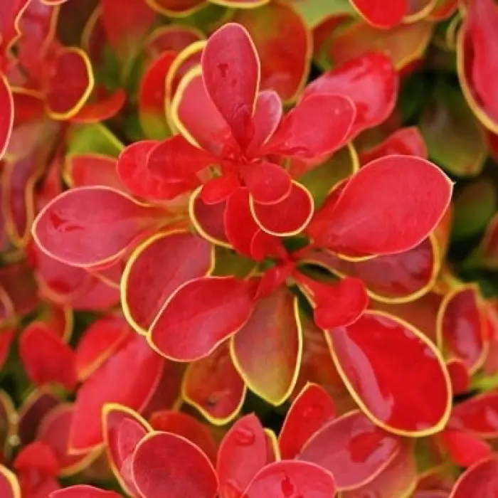 Листва: Мелкие, овальные, кораллово-малиновые листья с золотой каймой. Осенью приобретают багряно-алый оттенок.