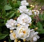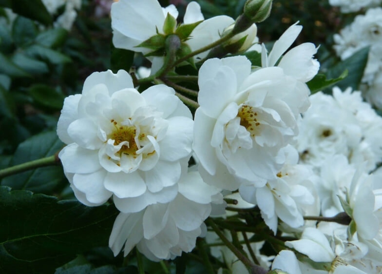 Цветки: Мелкие (около 3 см), чисто-белые, умеренно махровые, собраны в пышные кисти по 5-10 штук.