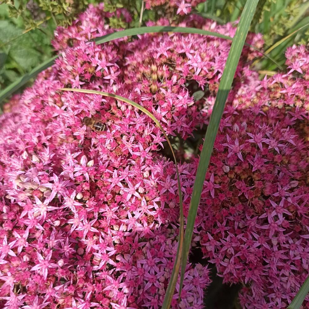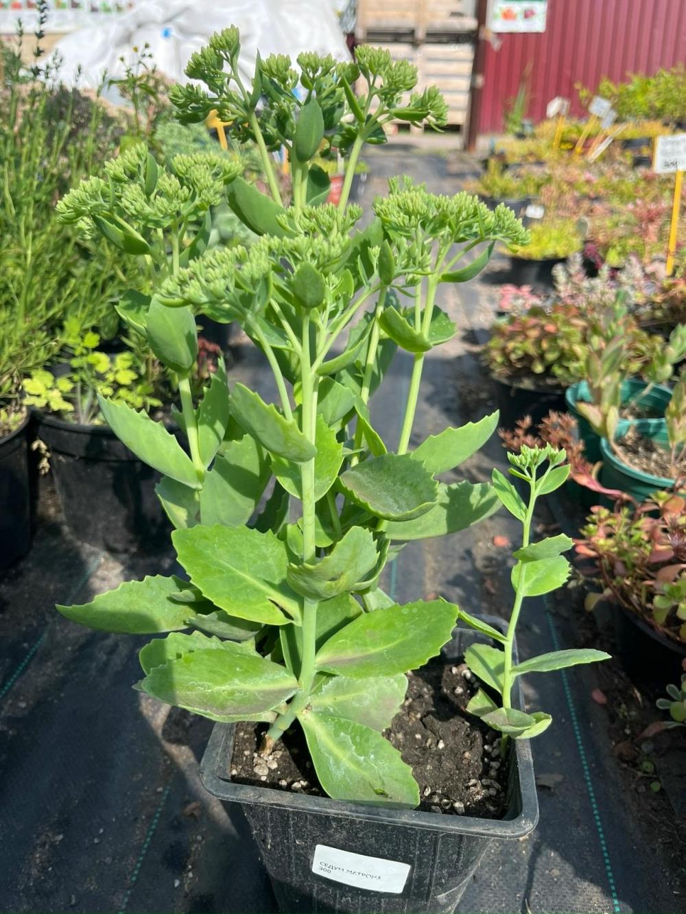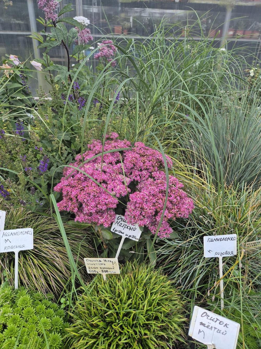 Очиток «Матрона» (Sedum telephium 'Matrona') — эффектный, неприхотливый многолетник с темно-сизыми/бордовыми листьями на вишневых стеблях, крупными розовыми соцветиями-щитками, цветет в августе-октябре, высотой 60-80 см, любит солнце, засухоустойчив и морозостоек, идеален для рокариев, миксбордеров и клумб, декоративен весь сезон.