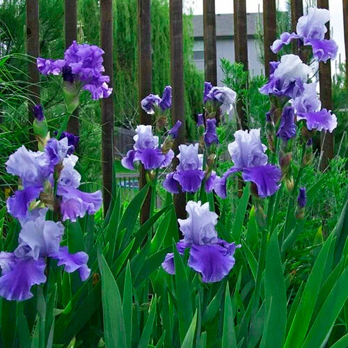 Ирис германский «Блашес» (Iris germanica «Blushes») — это красивый бородатый ирис высотой около 65 см, отличающийся двухцветными гофрированными цветами: верхние лепестки (стандарты) белые с голубыми прожилками, а нижние (фолы) — насыщенного фиолетового цвета, с яркой оранжевой или коралловой бородкой, цветет в мае-июне, предпочитает солнце, хорошо дренированные почвы и зимостоек до -40°C, отлично подходит для цветников и бордюров.