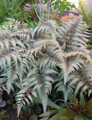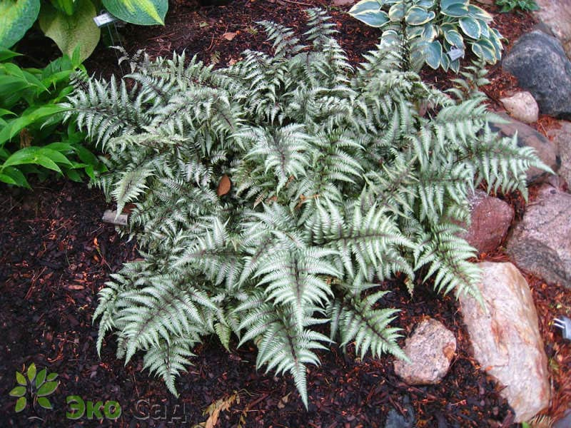 Кочедыжник «Металликум» (Athyrium nipponicum 'Metallicum') — это декоративный тенелюбивый папоротник высотой 40–60 см с резными ваями, которые меняют окраску от пурпурно-розовых у основания и по центральной жилке до серо-серебристых с металлическим отливом на светлых участках, особенно ярких весной и в начале лета; неприхотлив, любит влажную, рыхлую, гумусную почву и легкую полутень для лучшего проявления окраски.