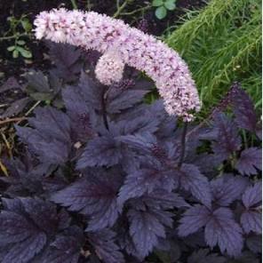 Клопогон 'Pink Spike' (Пинк Спайк) – эффектный многолетник с темно-пурпурной, резной листвой, декоративной весь сезон, и высокими свечевидными соцветиями из мелких бледно-розовых (кремово-розовых) цветочков, распускающихся в конце лета (август-сентябрь), достигает 1,5-2 м в высоту вместе с цветоносами, предпочитает полутень и влажные плодородные почвы, зимостойкий.