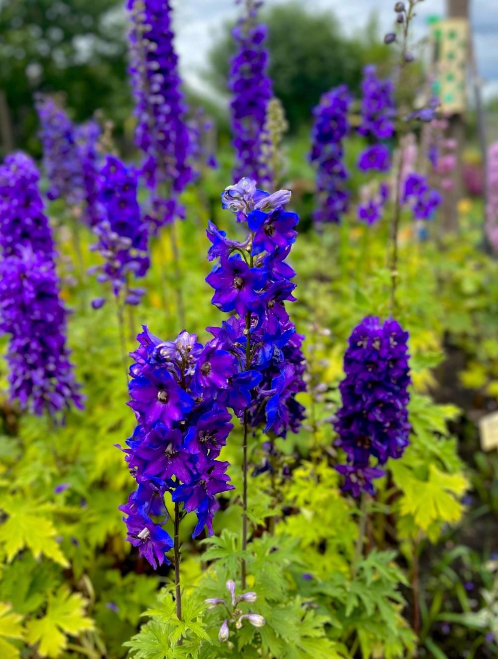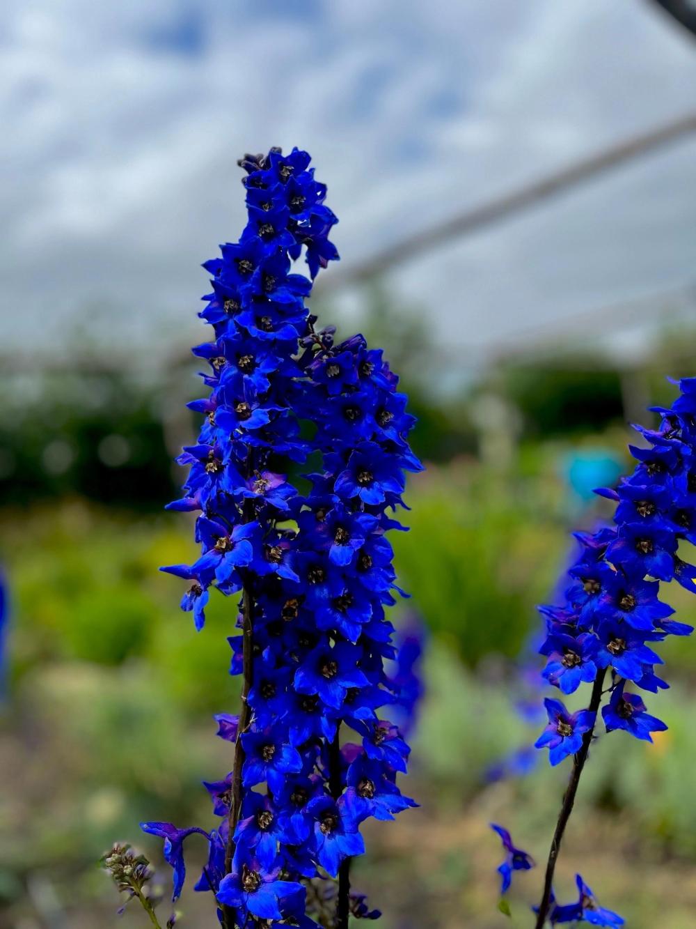 Дельфиниум сорта 'Dark Blue Dark Bee' (часто встречается под названием 'Magic Fountains Dark Blue Dark Bee') — это популярный многолетний сорт с ярко синими и плотными соцветиями. Внешний вид: Растение отличается очень экзотической и привлекательной окраской. Цветки насыщенного темно-синего цвета с контрастной сердцевиной (так называемой "пчелкой") — белой или черной, в зависимости от точного сортового названия. Цветки полумахровые, диаметром около 2-3 см, собраны в плотные кистевидные соцветия длиной до 50 см.