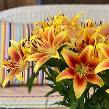 Лилия 'Кавери' (Kaveri) — это эффектный ОА-гибрид (Восточно-Азиатский) с крупными (до 20 см) воронковидными цветками, сочетающими темно-красный центр с переходом к желто-оранжевой кайме, с насыщенным ароматом. Растение достигает 110 см в высоту, цветет в июле-августе, неприхотливо, устойчиво к морозам и заболеваниям, любит солнце или легкую полутень, хорошо дренированную почву. Подходит для клумб, миксбордеров и срезки.