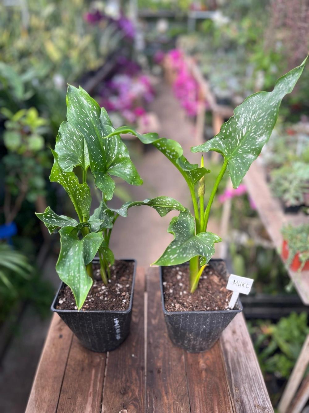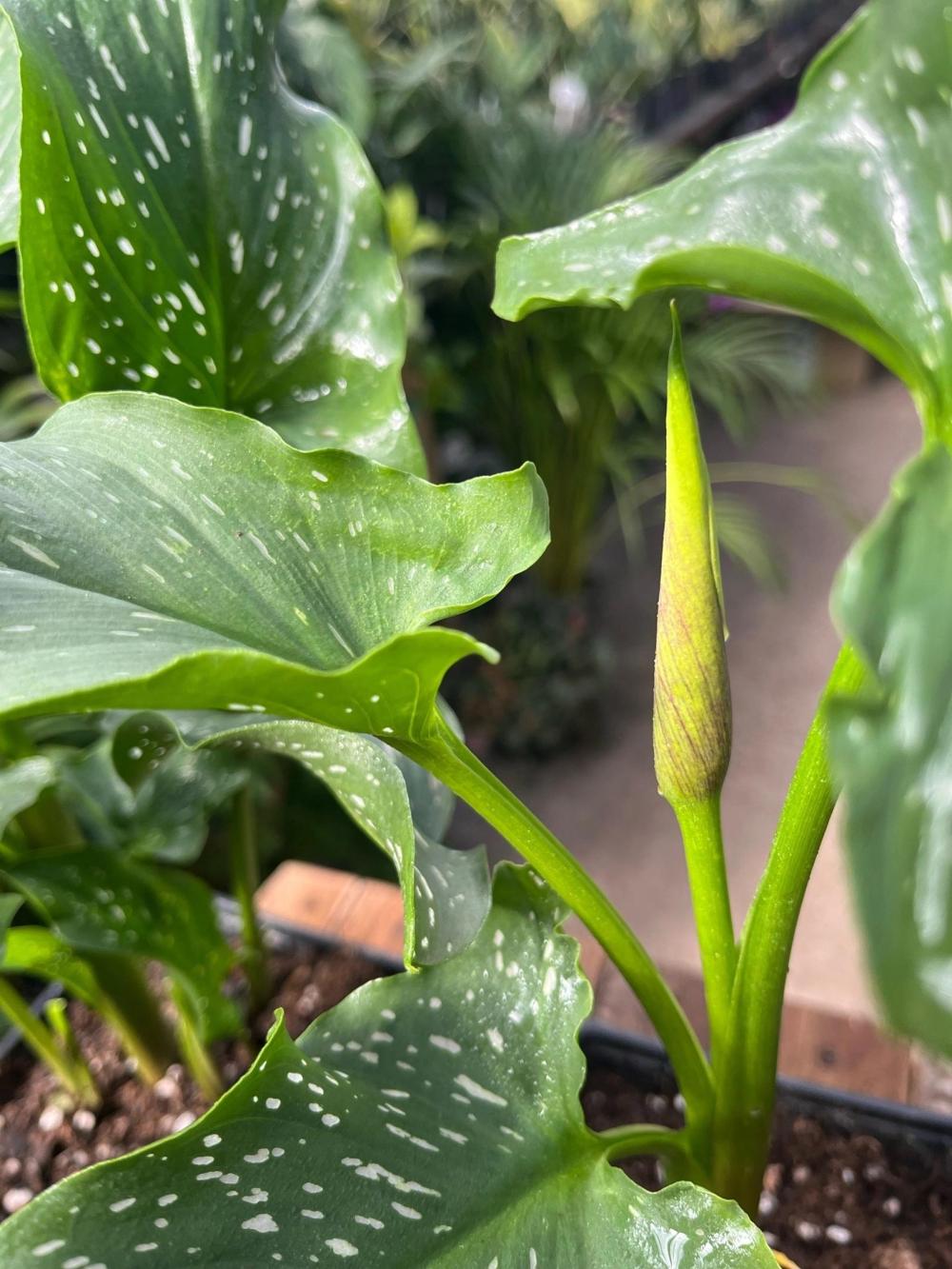 Листья: Декоративные, стреловидные, темно-зеленого цвета с многочисленными белыми или серебристыми крапинами (мраморный рисунок).