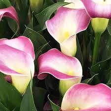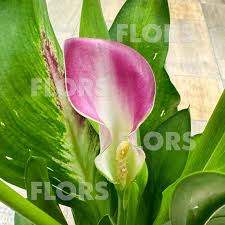 Цветок: Скульптурный, воронковидный, двухцветный – основной тон яркий розовый/малиновый с белыми/кремовыми переходами к основанию, желтый початок.