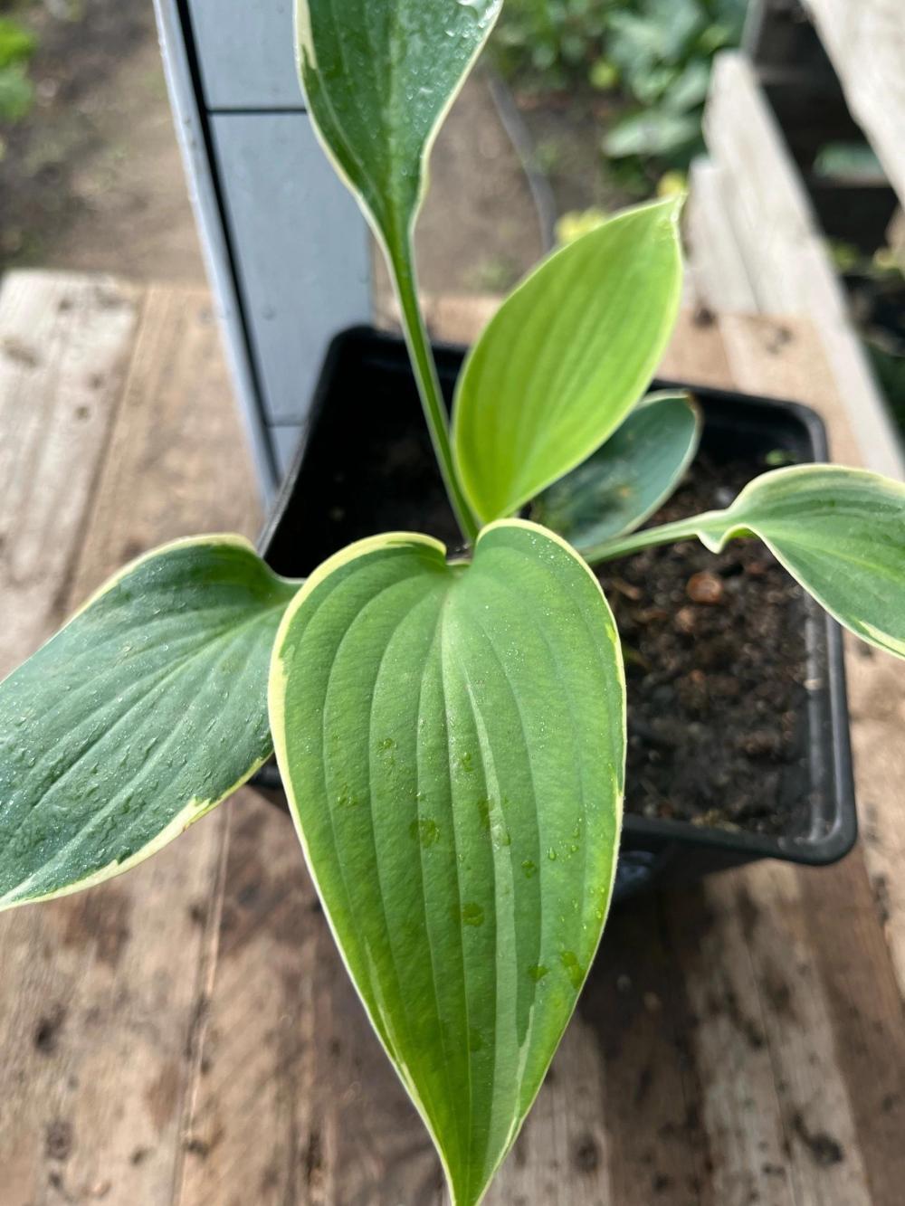 Листья: Большие, сердцевидные, плотные, сизо-зеленые с голубоватым оттенком в центре, с широкой неравномерной кремово-белой каймой, края волнистые, чашевидные. Размер листа примерно 27x20 см.