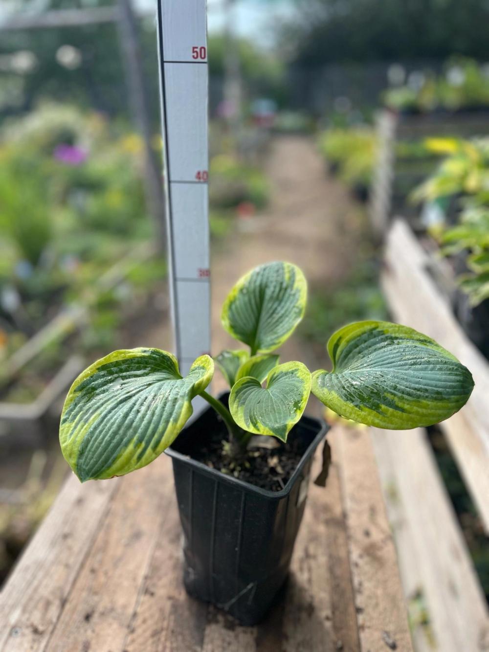 Листья: Крупные, сердцевидные, сине-зеленые в центре, с широкой кремово-желтой каймой, сизый налет, выпуклые, морщинистые, размер 36х30 см.
