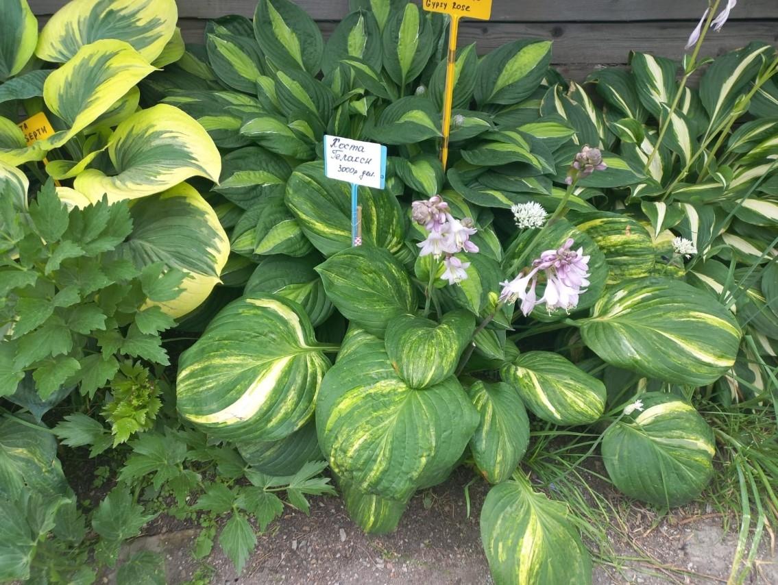 Хоста 'Galaxy' (Гэлакси) — эффектный среднерослый сорт хосты с крупными, плотными, текстурными темно-зелеными листьями, обильно покрытыми кремово-желтыми «ручейками» и полосами, имеющими слегка подвернутые края, куст до 40-50 см в высоту и 80 см в ширину, цветет лавандовыми цветами; предпочитает тень, влажные плодородные почвы, идеально подходит для миксбордеров, бордюров и контейнеров, создавая яркий акцент в тенистых садах.