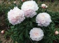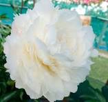 Цветы: Цветки крупные, махровые, розовидной формы, в диаметре могут достигать 20 см и более. При распускании бутоны имеют нежный розовый или сливочно-кремовый оттенок, который по мере полного раскрытия и под воздействием солнца светлеет до кремово-белого или белого цвета. Лепестки широкие, плотно прилегают друг к другу, создавая эффект пышного шара.