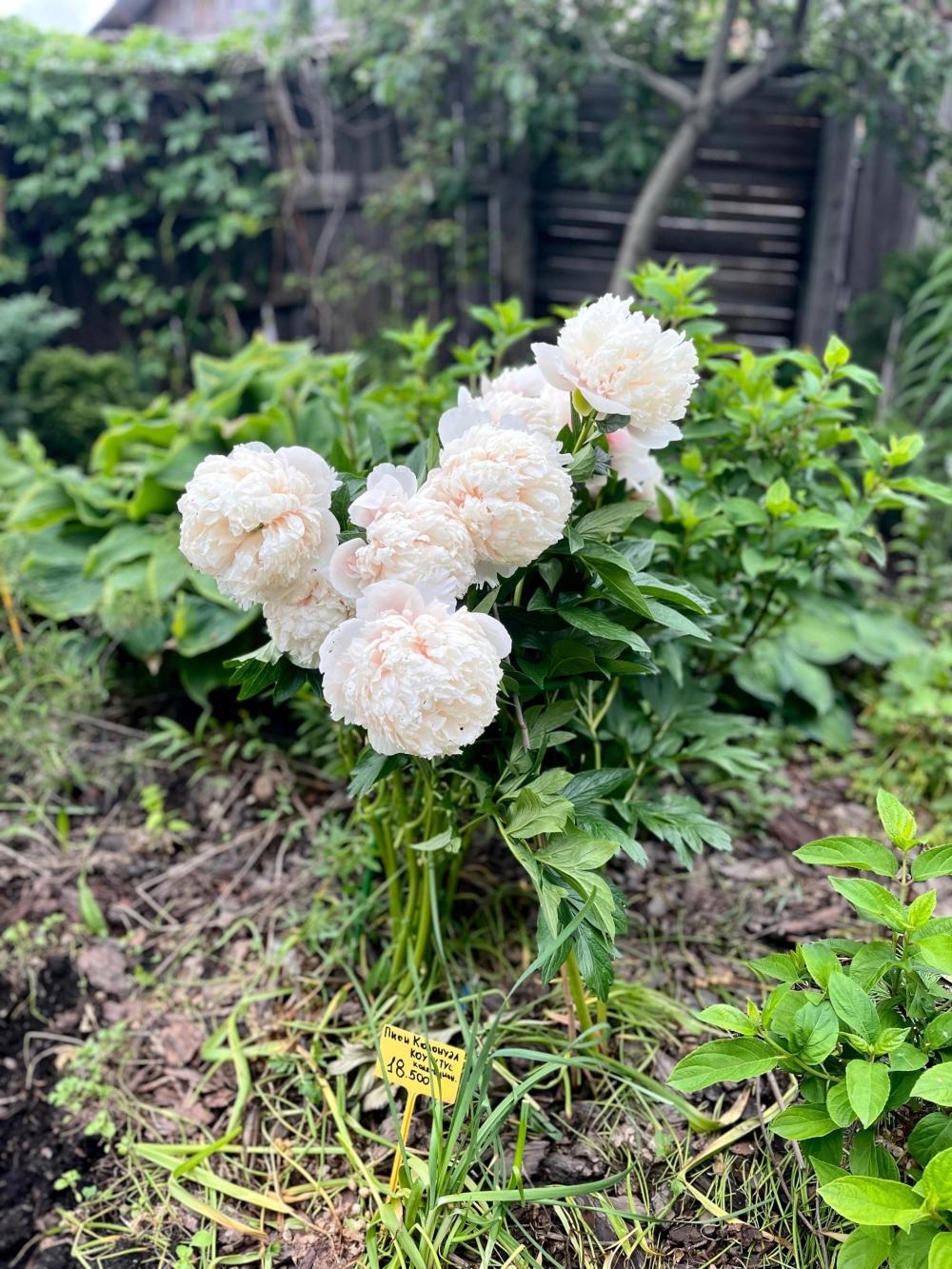 Пион 'Colonel Owen Cousins' (Колонель Оуэн Казинс) – это ранний, межвидовой гибрид с крупными, густомахровыми, бомбовидными цветками кремово-белого цвета с лососево-розовым свечением внутри, который при распускании приобретает молочно-белый оттенок, имеет слабый аромат, крепкие стебли и компактный куст до 70-75 см высотой, не разваливающийся, что делает его отличным ландшафтным сортом.