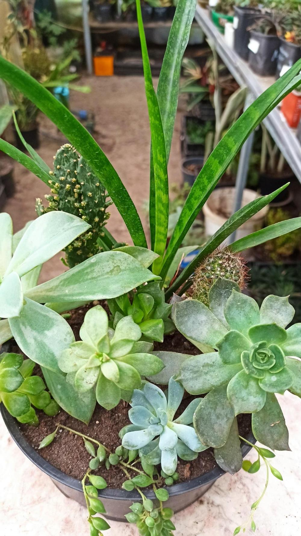 В горшке сансевиерия, эхеверии, крестовник, опунция и др.