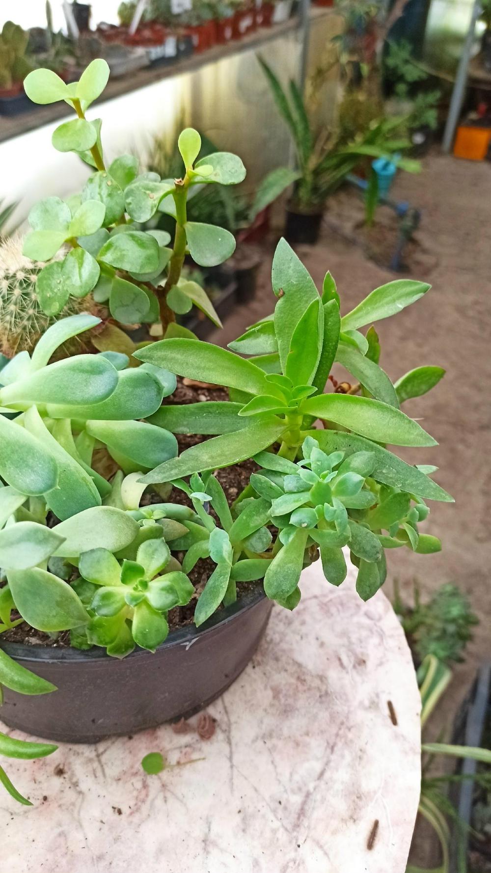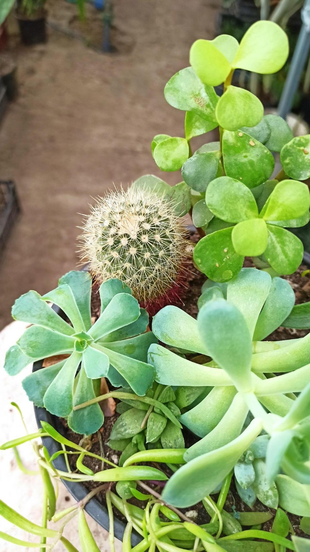 В горшке крестовник, маммиллярия, портулакария, эхеверии и др.