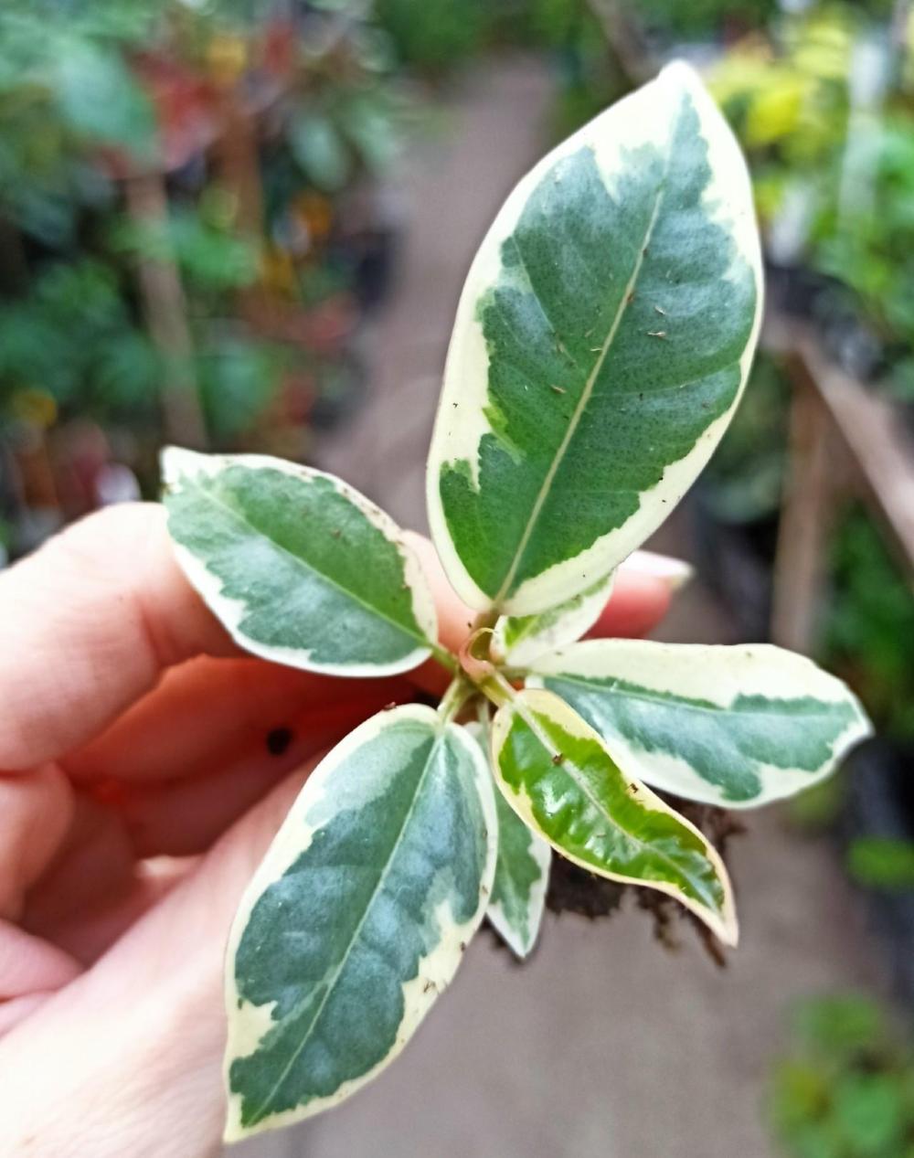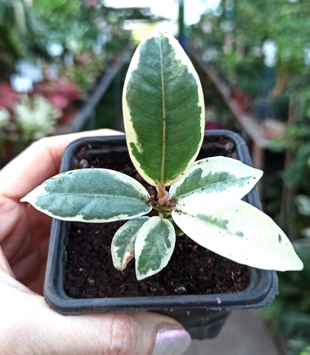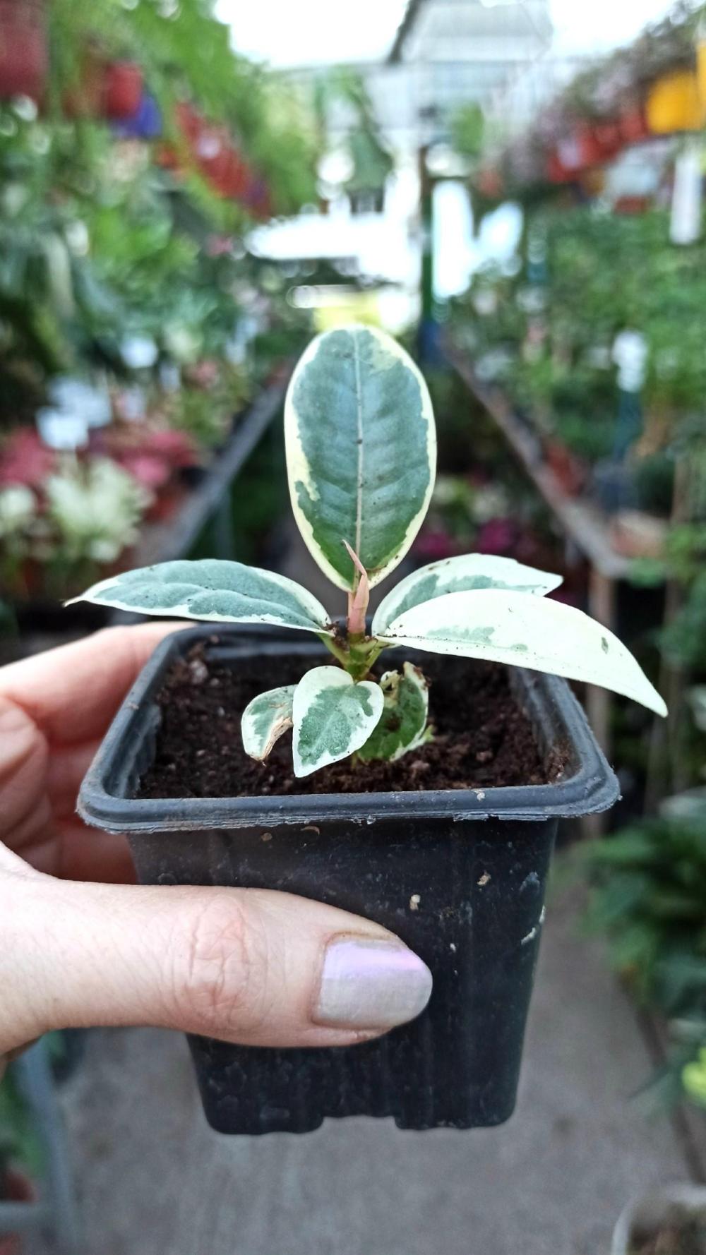 Фикус Эластика Тинеке (лат. Ficus Elastica Tineke) – симпатичное многолетнее комнатное дерево с пестрыми листьями, эластичный (или каучуконосный) сорт прямоствольных декоративных фикусов из семейства Тутовых. Естественная среда обитания – влажные тропики, субтропики. Размер обуславливается местом и условиями обитания. Растет в домашних условиях до 60см в высоту. Рост у Фикуса Эластики прямой и столбчатый. Можно стимулировать ветвление растения, обрезав стебель растения наверху (между узлами). Растение любит яркий непрямой свет. Очень важно очищать листья от пыли ваших растений, чтобы повысить эффективность фотосинтеза. Поливать умеренно примерно дважды в неделю мягкой отстоянной водой, дождавшись подсыхания верхнего слоя почвы. Растение в транспортировочном горшке диаметром 6см, советуем пересадить в горшок около 0,7л. Грунт подойдет для декоративно - лиственных растений.