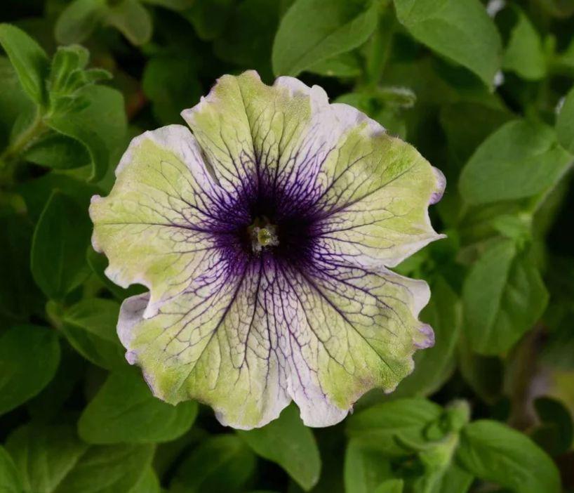 Очень яркая петуния с необычной расцветкой. Цветы крупные гофрированные, бело-салатовые с темно-фиолетовым центром и такими же темными прожилками. Высота куста около 35 см и ширина около 40 см. Цветение ранее, очень обильное и продолжительное. Растение хорошо держит ветер и дождь. Идеальный вариант для подвесных кашпо, вазонов и балконных ящиков.