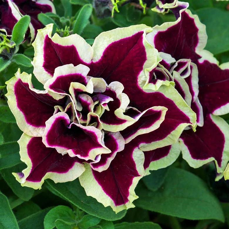 Фантастические махровые цветки! Угольно-бордовых лепестков с золотой каймой так много, что цветки выглядят как кружевные шары. Полуампельные растения с побегами длиной 60-80 см густо покрыты экзотическими цветками. Фурор на клумбе и в подвесном кашпо! Плотный ампельный кустик буквально усыпан бордовыми цветками, напоминающими розочки. Чудесный компаньон для сада и балкона с обильным и продолжительным цветением. Цветки не портятся от дождя и ветра. В дождливое лето цветки распускаются не так часто и количество их чуть меньше чем в солнечную погоду.