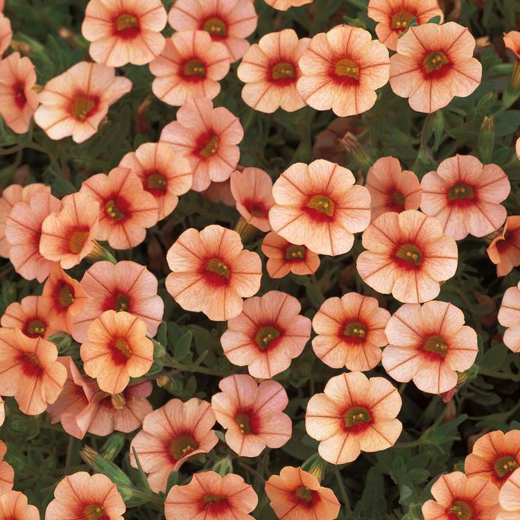 Калибрахоа сорта 'Eyeconic Peach' (Айконик Пич), которая также может быть известна под названиями Million Bells или Trailing Petunia. Это популярное ампельное растение, выведенное селекционерами Danziger.